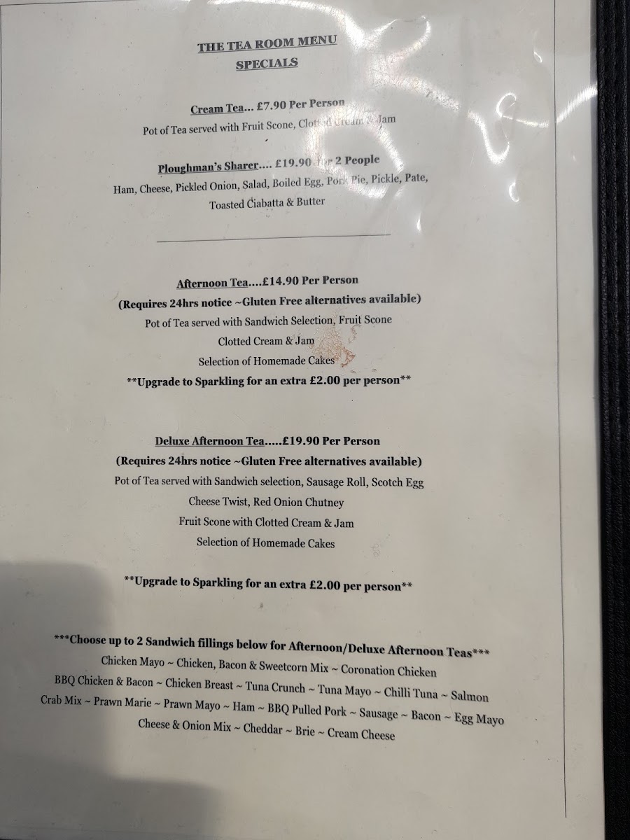The menu offers a variety of options suitable for breakfast, light meals, and coffee breaks. Visitors can expect a selection of hot breakfast items, including traditional components like black pudding and sausages. There are also baked goods and afternoon tea options featuring scones with jam and cream, sandwiches, and a range of cakes. For those seeking something lighter or a quick bite, sandwiches with various fillings are available in multiple portion sizes. Additionally, the menu includes sweet treats such as ice cream sandwiches, meringues, and gingerbread biscuits.